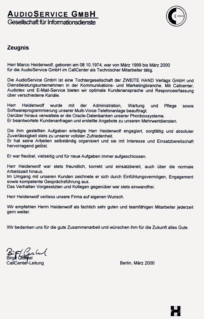 03/1999 - 03/2000Audioservice GmbHArbeitsbereichstudentischer Mitarbeiter - Audiotex Programmierung und AdministrationSchwerpunkte> Betreuung der Audiotex Unix und OS/2 Systeme