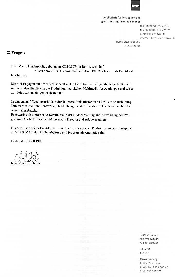 04/1997 - 08/1997BVM-gesellschaft für konzeption und gestaltung digitaler medienArbeitsbereichPraktikum - Mitarbeit bei der Entwicklung einer Edutainment CD-RomSchwerpunkte> Director (inkl. Lingo Programmierung)