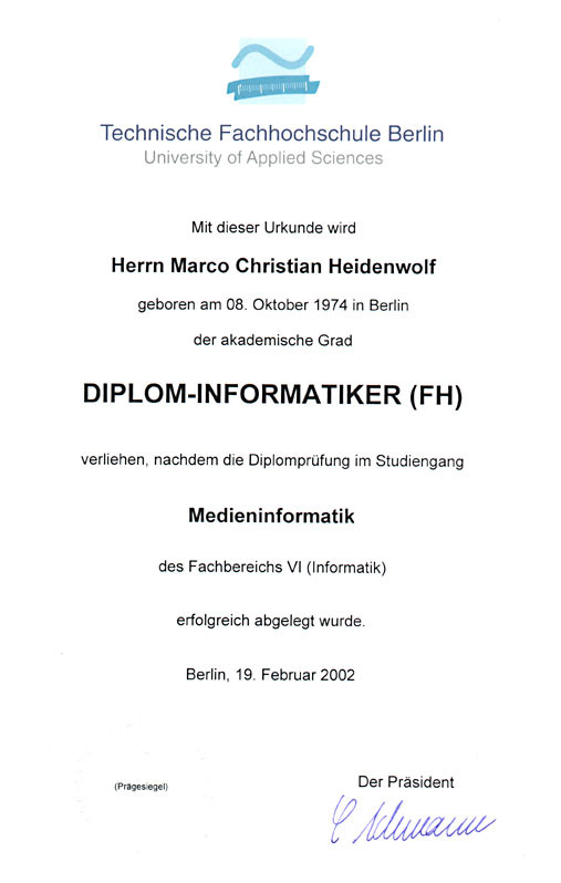 10/1997 - 02/2002Technische Fachhochschule BerlinStudium der MedieninformatikAbschlussDiplom-Informatiker